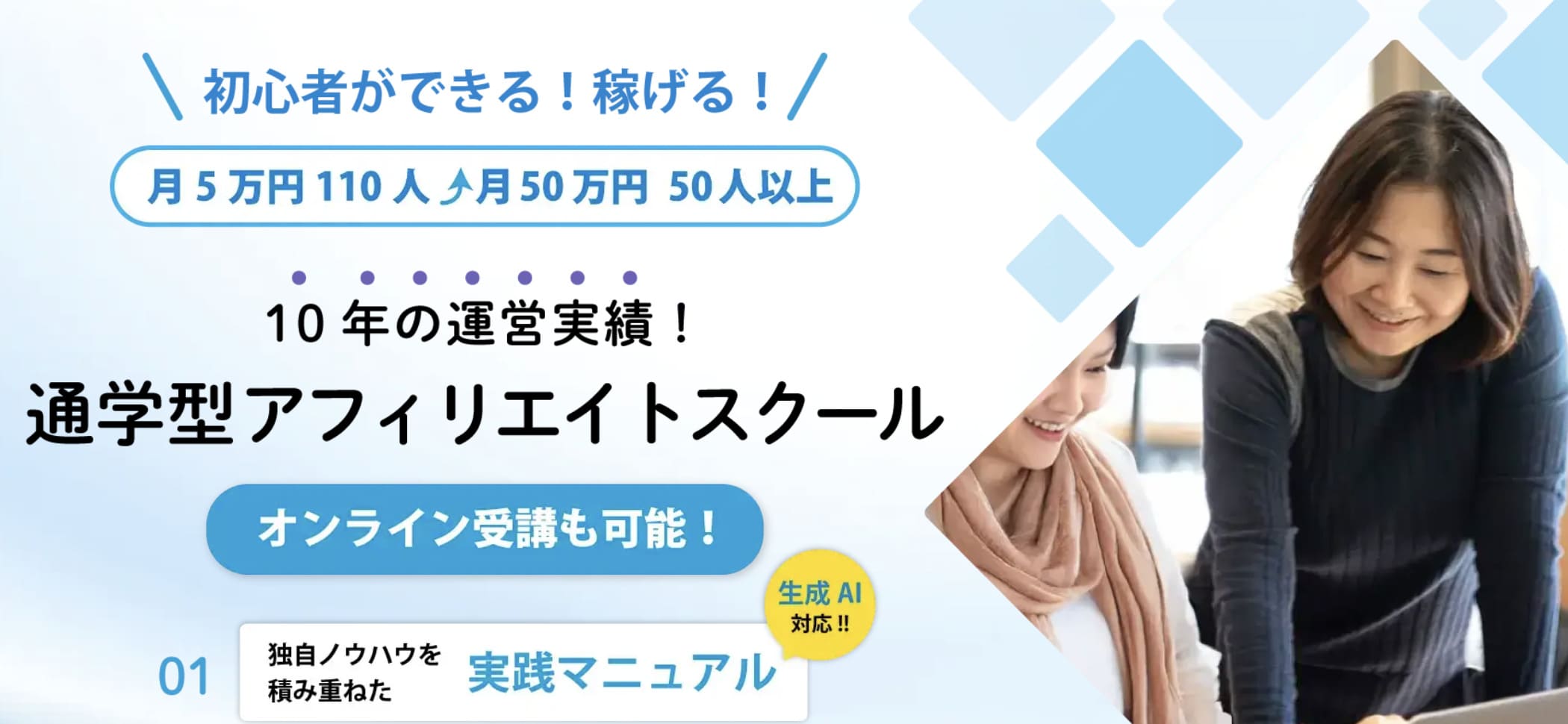 『ATUS』は、月5万円以上の収益を上げることを目的としたアフィリエイトスクールで、東京(高田馬場校)と大阪(本町校・うつぼ本町校)に教室があります。最近ではオンライン校も導入されています。