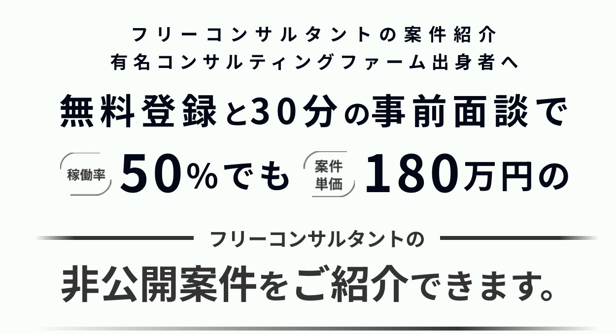 ITコンサルタントにとって、営業工数をかけず、かつ安定して仕事を獲得するには、フリーコンサルタント専門エージェントに登録することが最も有効です。