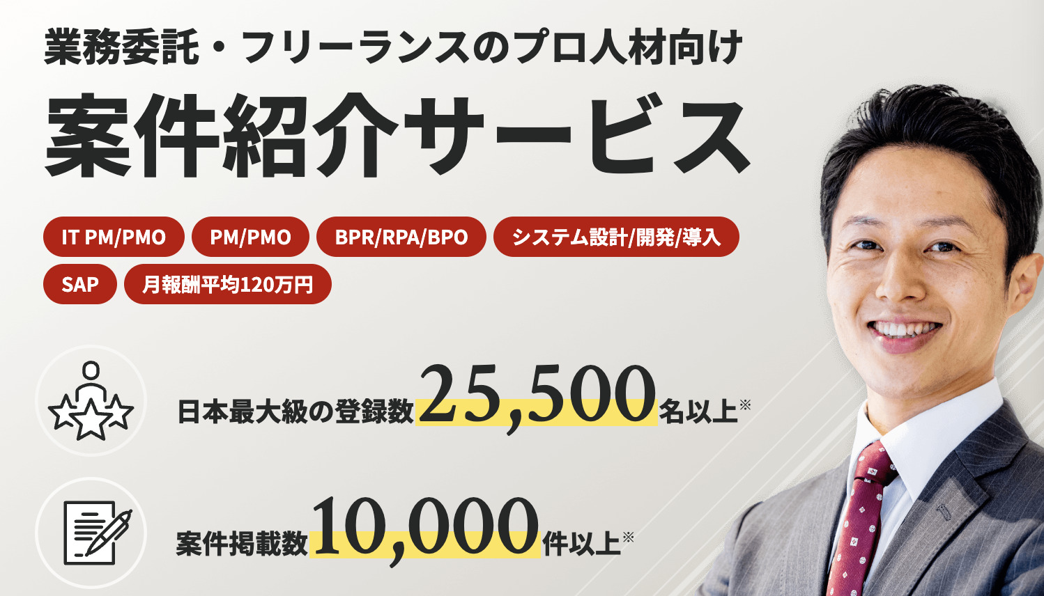 多種多様な業界・業務領域の案件を取り扱っており、登録者数は約22,000名、取引社数は約980社となっており、豊富なネットワークと案件数を保有しています。