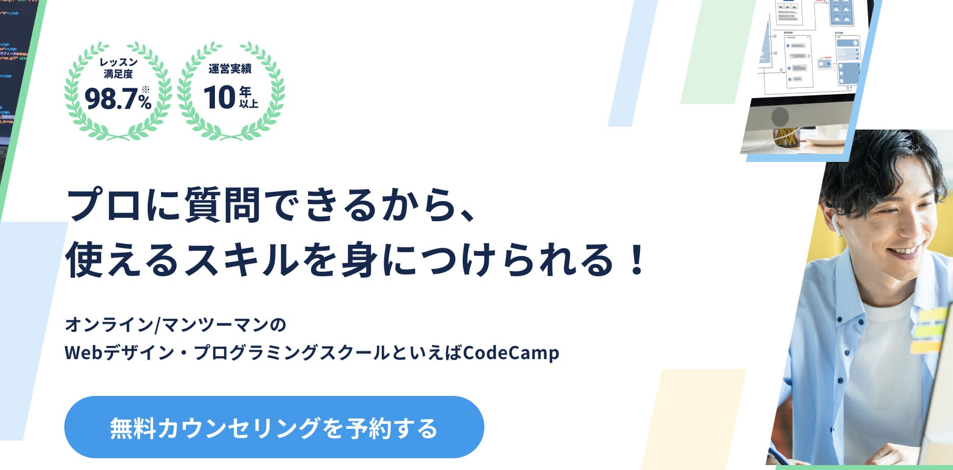 『CodeCamp』では、IllustratorやPhotoshopを活用した写真加工やバナー・ロゴ制作、Webサイトのデザインカンプ制作など、制作の現場で即戦力となるWebデザインスキルを身につけることができます。