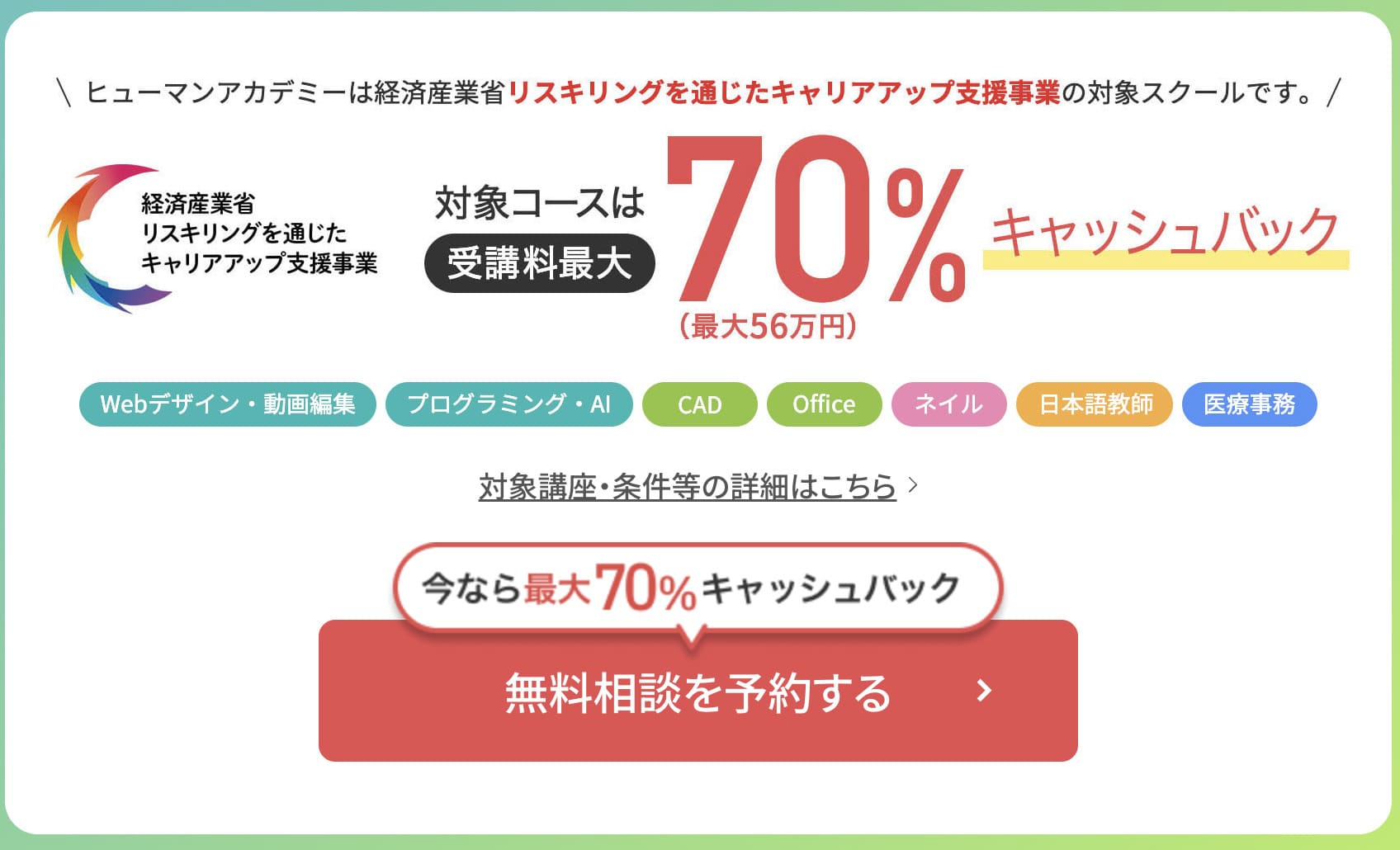 | コース一覧 | Webデザイナーコース:645,663円 Webデザイナー総合コース:761,839円 Web動画クリエイター総合コース:1,009,563円 ※教育訓練給付金制度の適用で受講料20%off(上限10万円) |