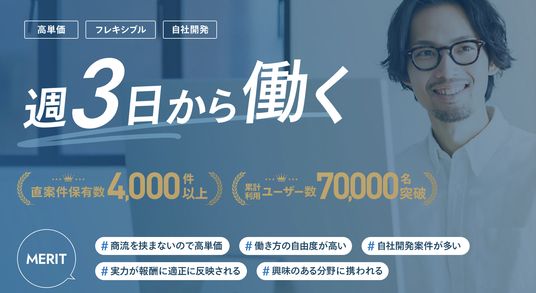 | 特徴 | フルリモート案件・週2日から稼働できる副業案件が豊富 | クリエイター向け案件数業界No1のフリーランス・副業エージェント |