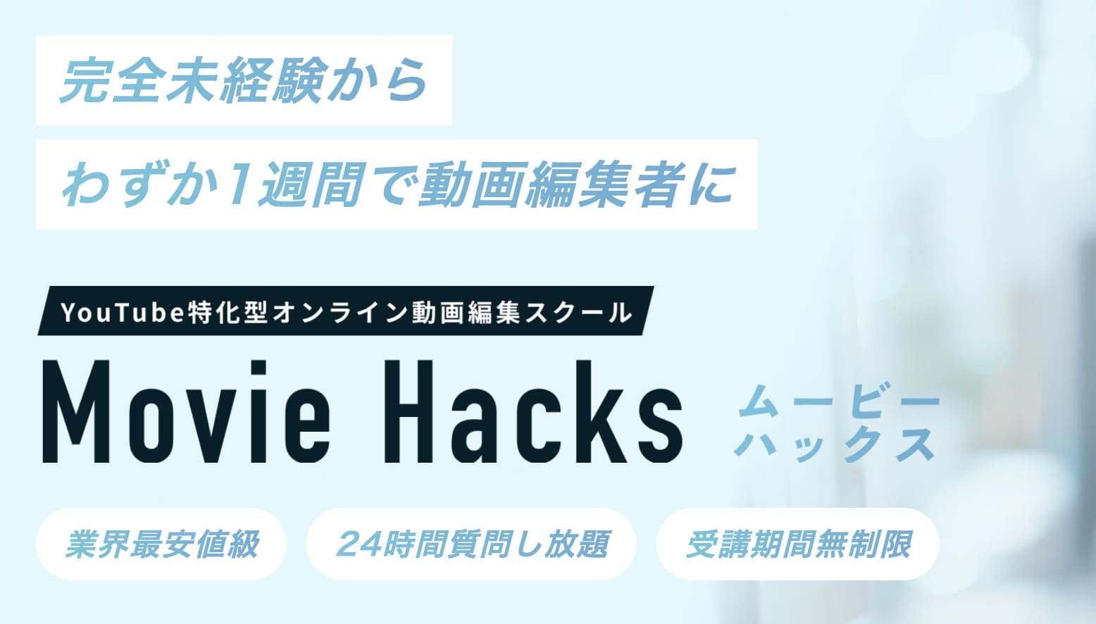 MovieHacksは、動画編集の初心者にとって、手頃な価格設定と手厚いサポート体制が魅力的なオンライン講座です。講師の実務経験とYouTuberとしての活動も、受講生にとって信頼できるポイントの一つです。