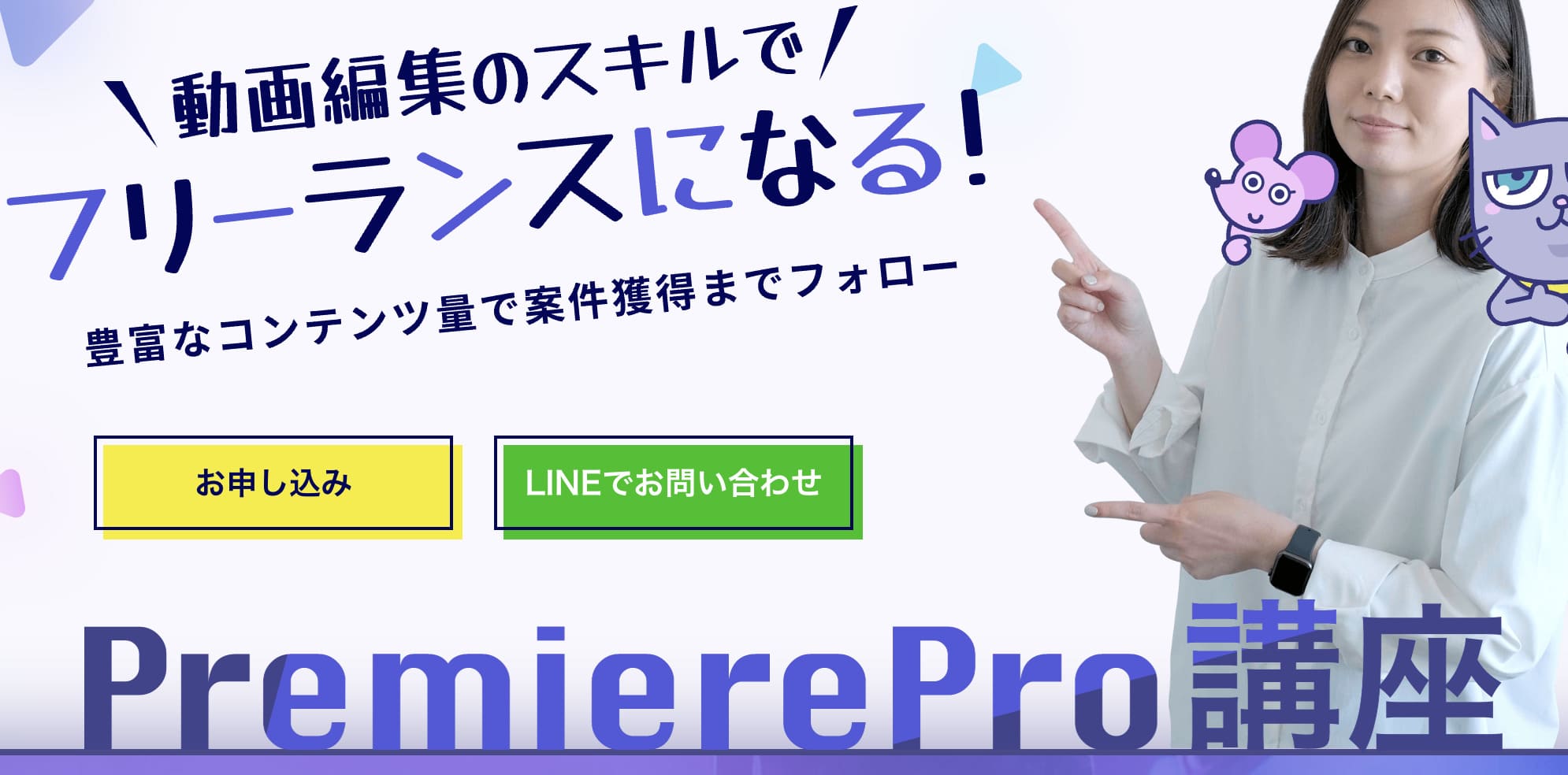 Premiere ProとAfter Effectsを高いレベルまで学び、YouTubeなどの動画編集はもちろんのこと、広告やPR動画、MVなどハイエンドな動画制作ができるようになります。
