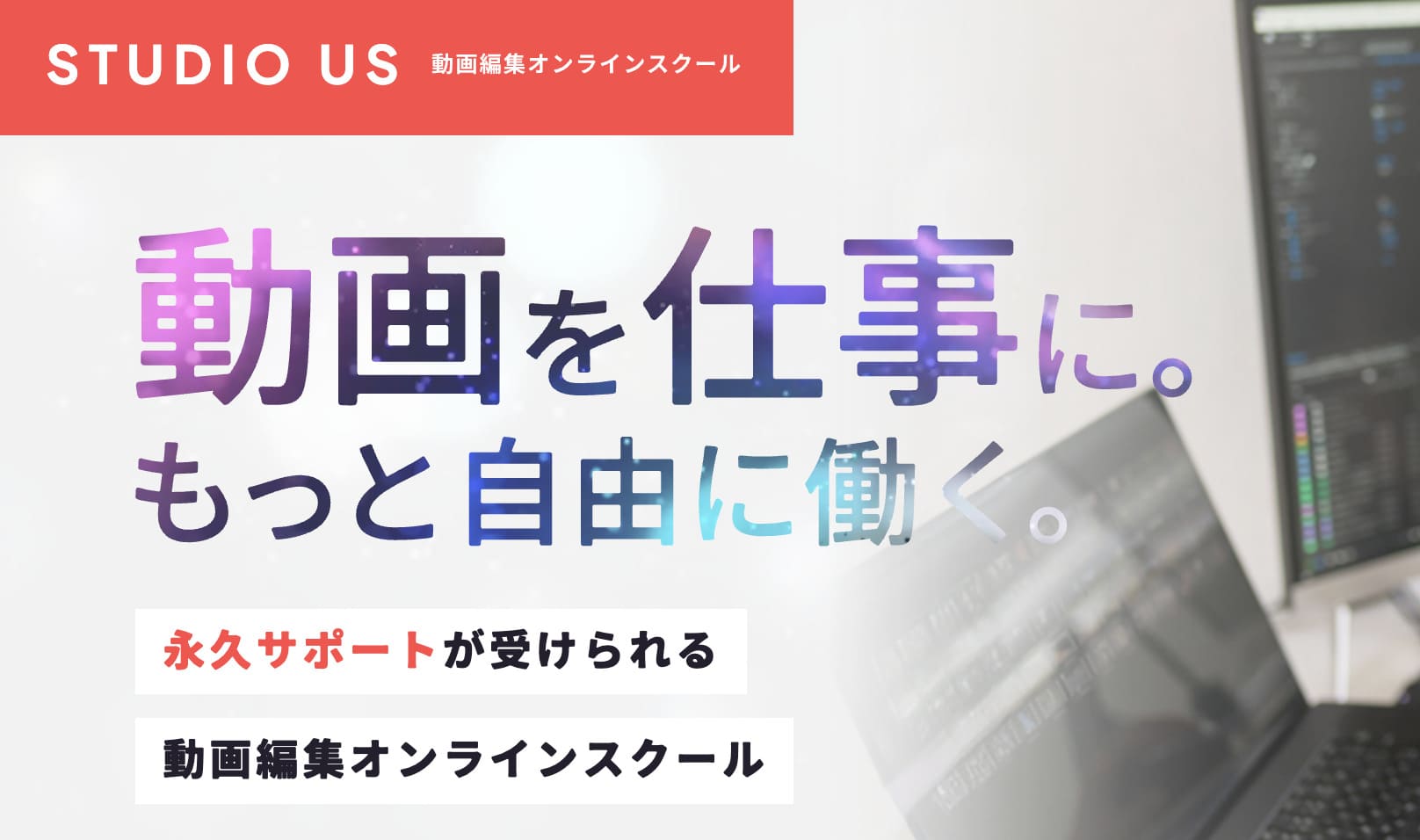手頃な価格設定でありながら、充実したカリキュラムと仕事獲得のサポートまで提供しているstudio USは、コストパフォーマンスに優れた動画編集スクールです。