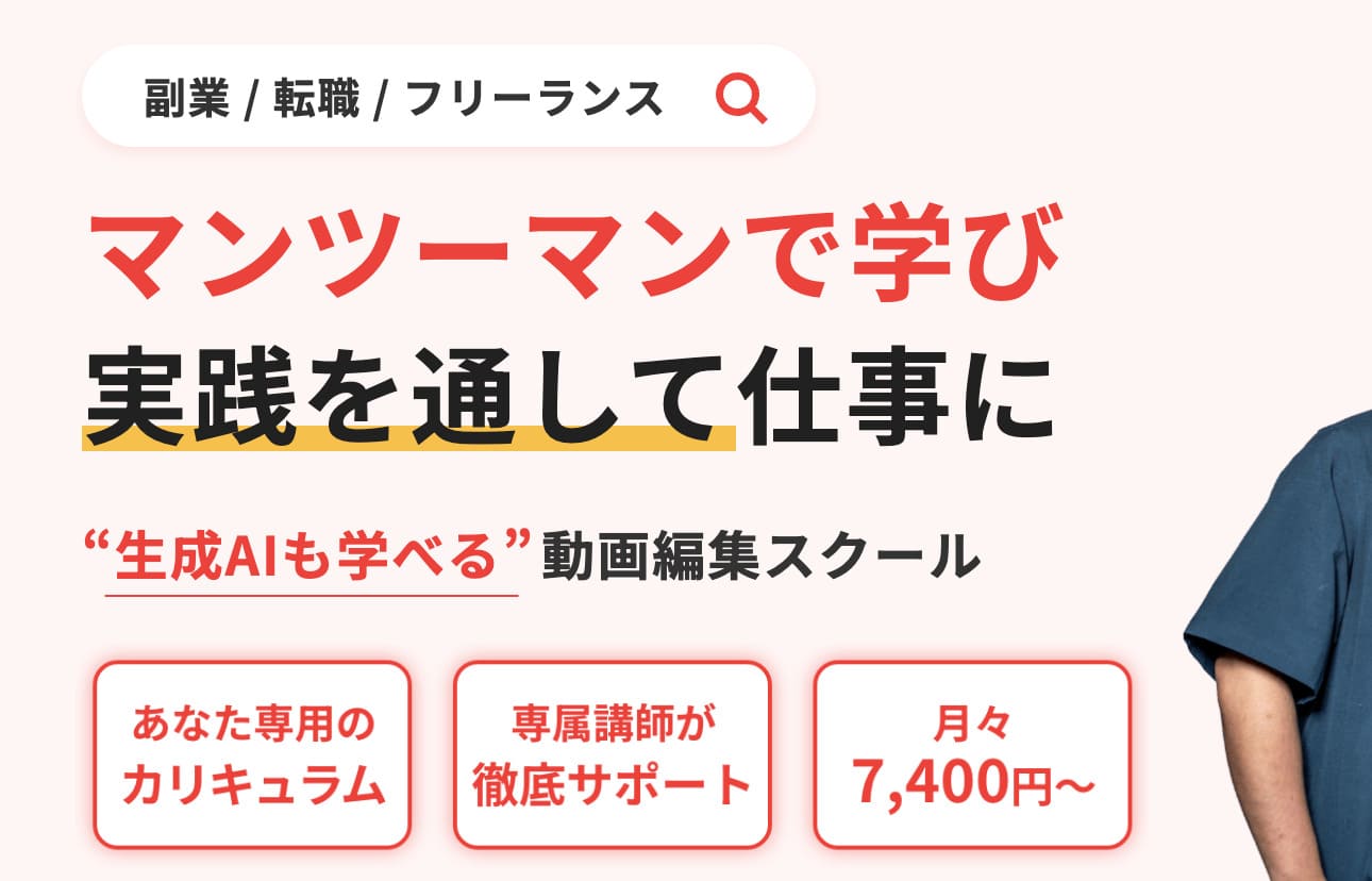 | 特徴 | ・受講者数3,000名以上/SNS口コミ数No1の動画編集スクール ・動画編集からディレクションまで徹底的に学べる ・現役の動画クリエイターによるマンツーマンレッスン ・独立後の営業活動に役立つポートフォリオを制作 | ・構成→編集→納品といった一連の流れを習得 ・マンツーマンのメンタリング付き ・チャットで毎日相談できる ・Adobeコンプリートプラン2ヶ月分無償提供 | ・授業内で動画を約50本制作する実践的なカリキュラム ・1,000本以上の動画講座を視聴可能 ・一度受講すると教材を無期限で視聴できる ・単価の高いPR動画制作を主体にしたカリキュラム |